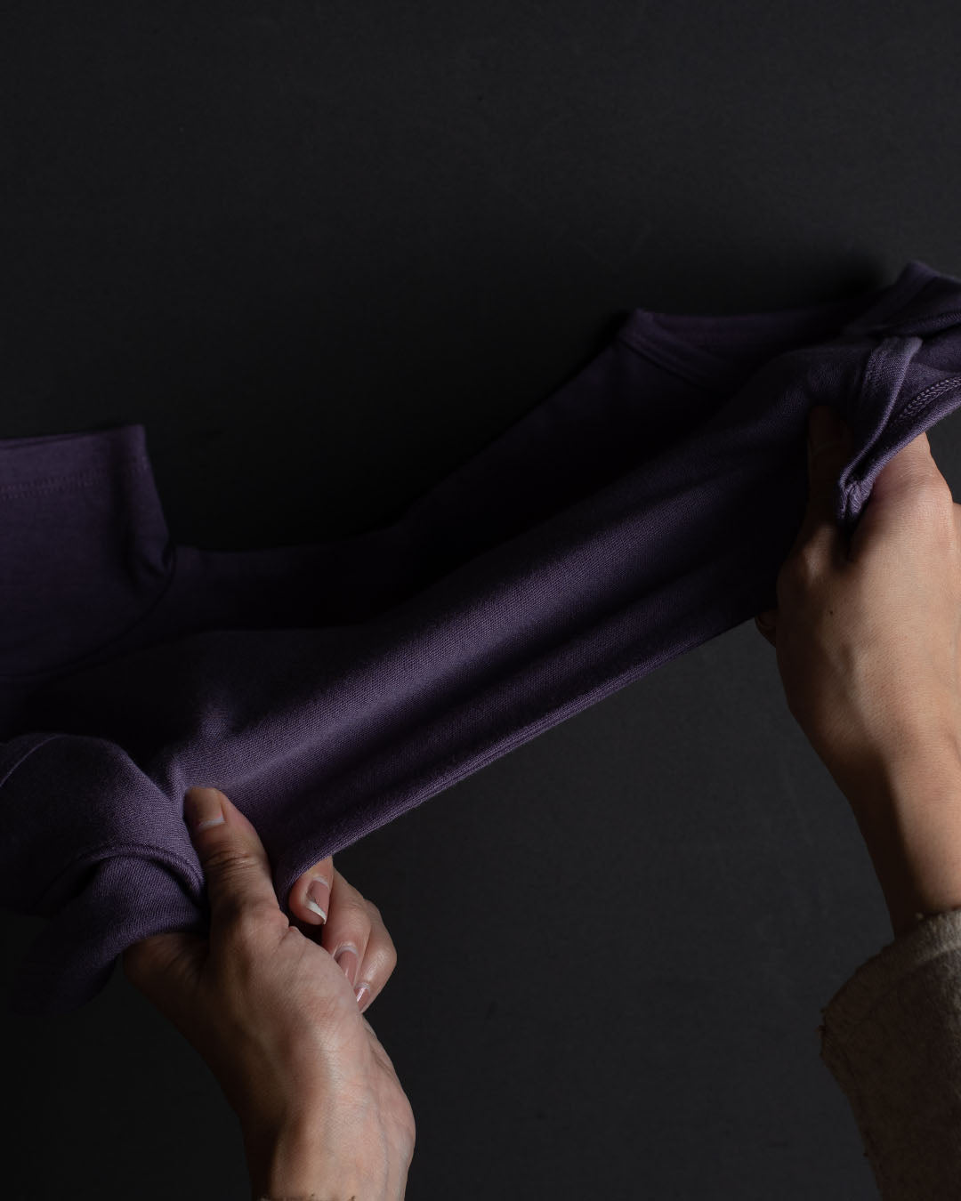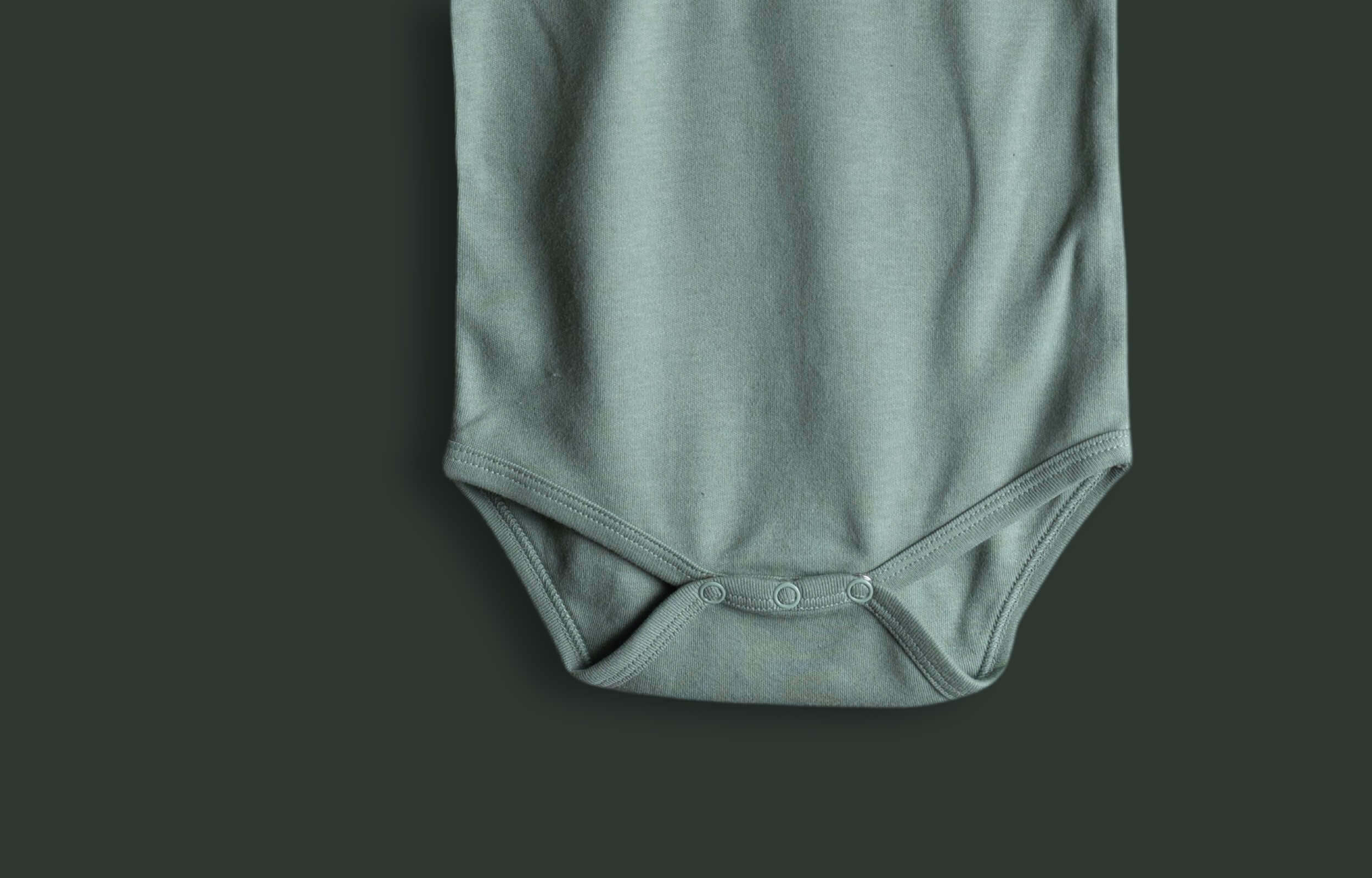Buttons at the crotch provide convenience for changing diapers without having to remove the garment.